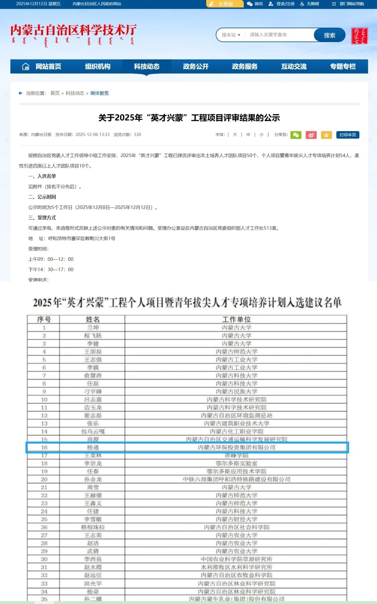 近日,2025年“英才興蒙”工程項目評審結(jié)果出爐,內(nèi)蒙古生態(tài)環(huán)境大數(shù)據(jù)有限公司楊通博士經(jīng)經(jīng)過層層選拔,最終成功入選該工程青年拔尖人才專項培養(yǎng)計劃。