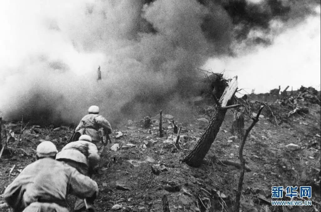 1952年,在上甘嶺戰(zhàn)役中,中國(guó)人民志愿軍指戰(zhàn)員在炮火支援下,攻上537.7高地北山。新華社發(fā)